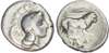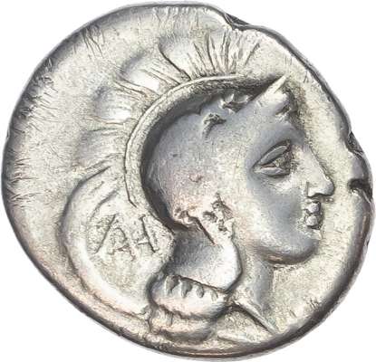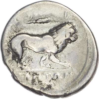Head of Athena left, wearing crested Phrygian helmet decorated with wing, AI behind. Rev. Lion advancing right, ear of grain above, Π below, YEΛHTΩN in exergue. (HN Italy 1309; SNG ANS 1379). About Fine.