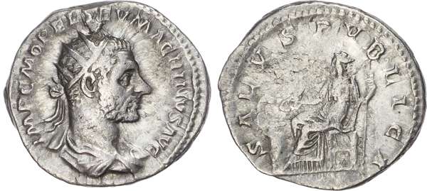 IMP C M OPEL SEV MACRINVS AVG, radiate and cuirassed bust right. Rev. SALVS PVBLICA, Salus seated left, holding patera and feeding snake rising from altar. (RIC 88). Very Fine. Rare.