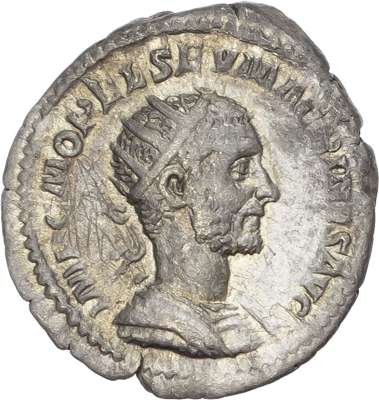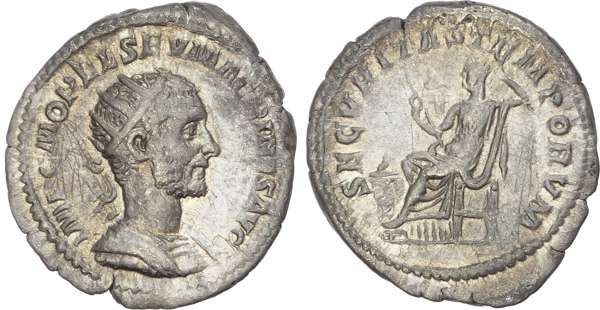 IMP C M OPEL SEV MACRINVS AVG, radiate and cuirassed bust right. Rev. SECVRITAS TEMPORVM, Securitas seated left, holding sceptre. (RIC 95). Very Fine. Rare.