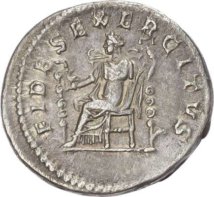 IMP CAES M AVR ANTONINVS AVG, radiate, draped and cuirassed bust right. Rev. FIDES EXERCITVS, Fides seated left on throne, flanked by two standards. (RIC 70; BMC 12). Good Very Fine.