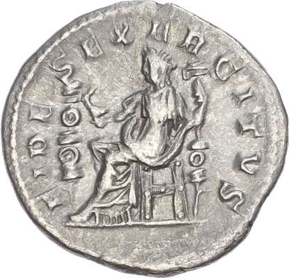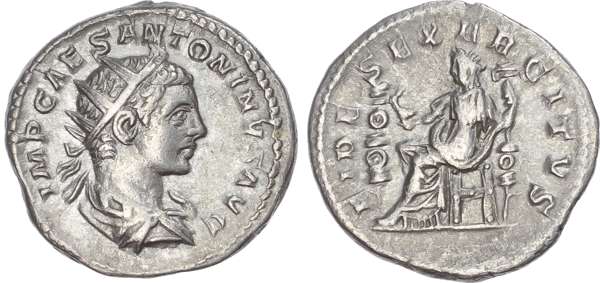 IMP CAES M AVR ANTONINVS AVG, radiate, draped and cuirassed bust right. Rev. FIDES EXERCITVS, Fides seated left on throne, flanked by two standards. (RIC 70; BMC 12). Good Very Fine.
