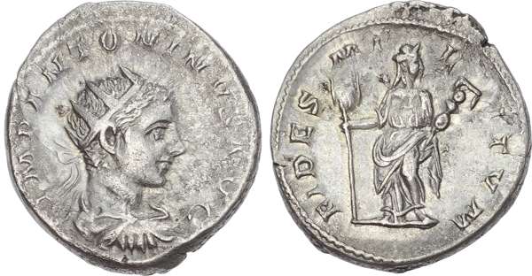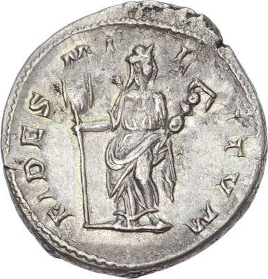 IMP ANTONINVS AVG, radiate, draped and cuirassed bust right. Rev. FIDES MI-L-ITVM, Fides standing left, head right, holding vexillum and standard. (RIC 72; BMC 128). Good Very Fine.