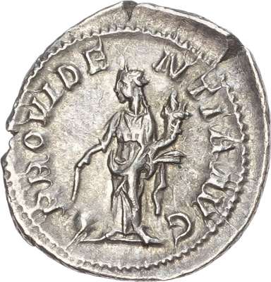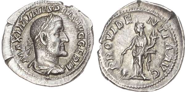 MAXIMINVS PIVS AVG GERM, laureate, draped and cuirassed bust of Maximinus facing right. Rev. PROVIDE-NTIA AVG, Providentia standing left, holding wand over globe and cornucopiae. (RIC 13; BMC 86). Good Very Fine.