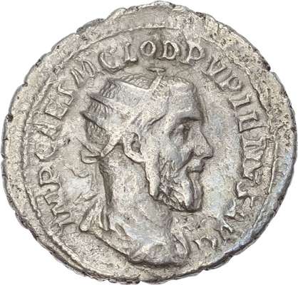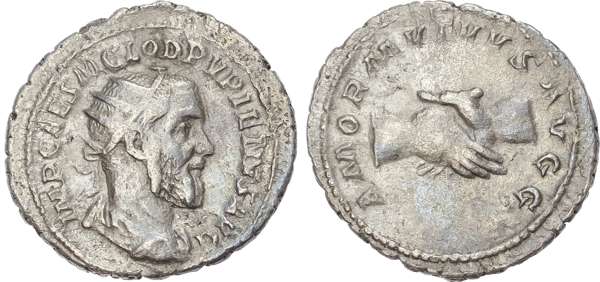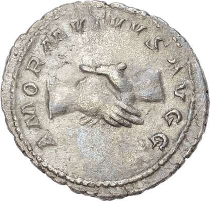 IMP CAES PVPIENVS AVG, radiate, draped and cuirassed bust of Pupienus right. Rev. AMOR MVTVVS AVGG, clasped hands. (RIC 9b). Good Fine.