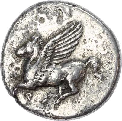 Pegasos flying left, koppa below. Rev. Head of Athena left, wearing a Corinthian helmet, knucklebone behind. (Pegasi 400). Very Fine. Some pitting to obverse.