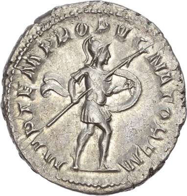 IMP GORDIANVS PIVS FEL AVG, radiate, draped and cuirassed bust of Gordian III right. Rev. MARTEM PROPVGNATOREM, Mars advancing right, holding spear and shield. (RIC 147). About Extremely Fine.
