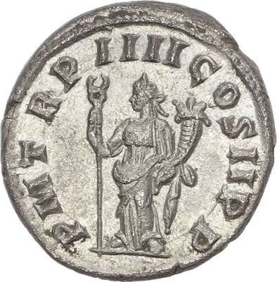 IMP M IVL PHILIPPVS AVG, radiate, draped and cuirassed bust of Philip left. Rev. PM TR P IIII COS II P P, Felicitas standing left, holding long caduceus and cornucopiae. (RIC 233 var (bust type)). Extremely Fine. Very Rare.