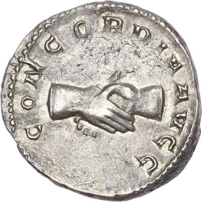 Q HER ETR MES DECIVS NOB C, radiate, draped and cuirassed bust of Herennius right. Rev. CONCORDIA AVGG, clasped hands. (RIC 138). About Extremely Fine.