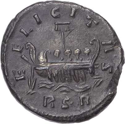 IMP CARAVSIVS P F AV, laureate, draped and cuirassed bust of Carausius facing right. Rev. FELICITAS, galley right, with mast and four rowers, RSR in exergue. (RIC 56o; Sheil 56; Casey pl. 2, 11; RSC 53). Good Very Fine or better. Some edge loss. Darkly toned. Extremely Rare, no others on CoinArchives.