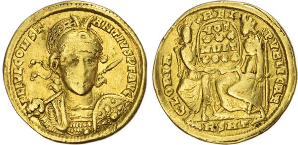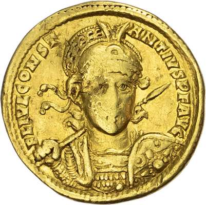 Diademed, helmeted and cuirassed bust of Constantius facing, holding spear and shield decorated with horseman motif. Rev. Constantinopolis (right) and Roma (left) seated facing, holding shield between them inscribed; VOT / XXX / MVLT / XXXX, RSMT in exergue. (RIC 293; Depeyrot 14/1). Good Fine. Wear to the high points.