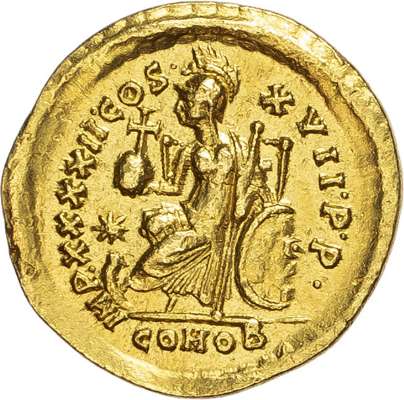 Diademed, helmeted and cuirassed bust of Theodosius facing, holding spear and shield decorated with horseman motif. Rev. Constantinopolis seated left, holding globus cruciger and sceptre, CONOB in exergue. (RIC 257; Depeyrot 81/1). Good Very Fine.