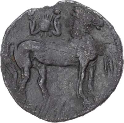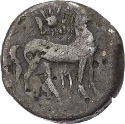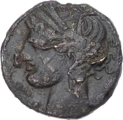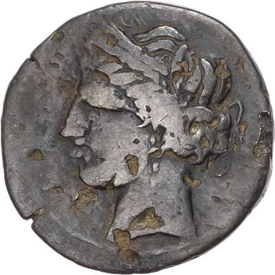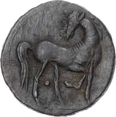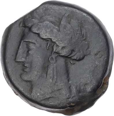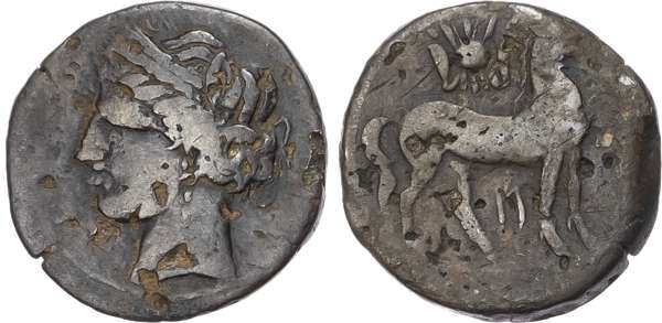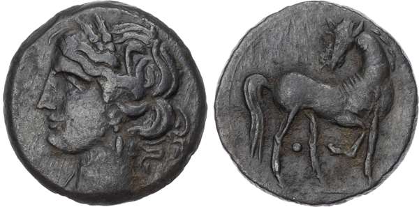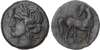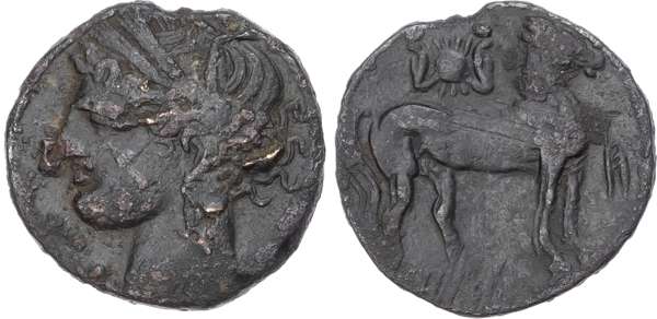 Head of Tanit facing left. Rev. Horse standing right and horse’s head right. (Various types and sizes). Generally About Fine.