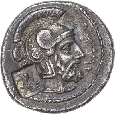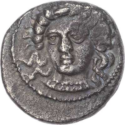 Female head facing slightly to the left, wearing necklace of pearls. Rev. Bearded and helmeted male head right, TRKMW (Aramaic) to right, countermark of ‘BAL’ above a man-headed bull. (SNG BN 258-70; BMC 30; SNG Levante 79). Very Fine. Toned.