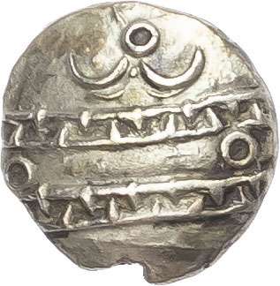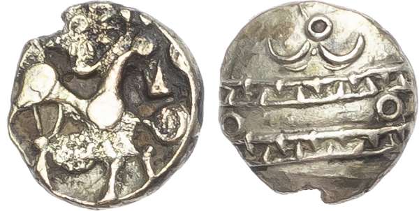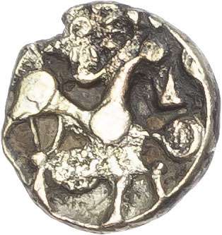 Two parallel zig-zag bands, two rings between them, crescent horns linked by ring above. Rev: Horse right, floral sun above, ringed pellet to right. (ABC 635; VA -; BMC -). Obverse Extremely Fine. Reverse Good Fine. Extremely Rare, possibly the second known example. Cited as ‘unique?’ in ABC.