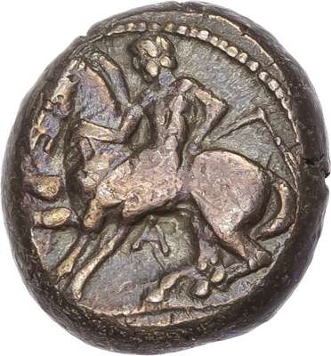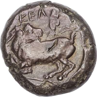 Youth, holding whip, dismounting horse left, A below. Rev. KEΛ, Goat kneeling left, head right. (SNG BN 52). Good Fine.