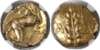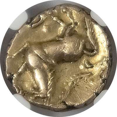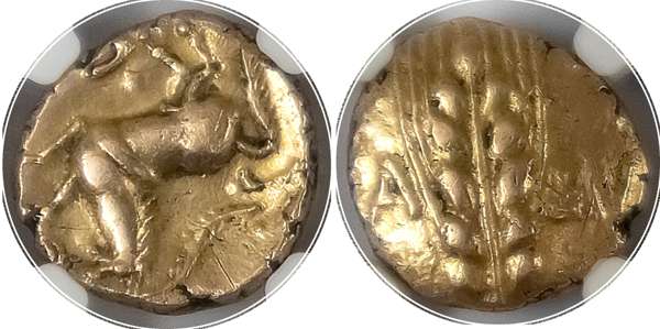CA-MV, large, vertical ear of grain. Rev: CVN, horse leaping right, branch and pellets above. (ABC 2774; VA 1925; BMC 1772-83). Good Very Fine. Struck on a somewhat short flan. Pleasing gold. ‘Brushed’.
