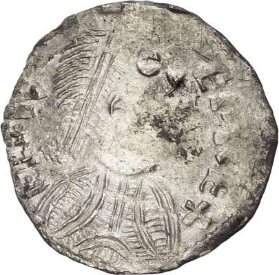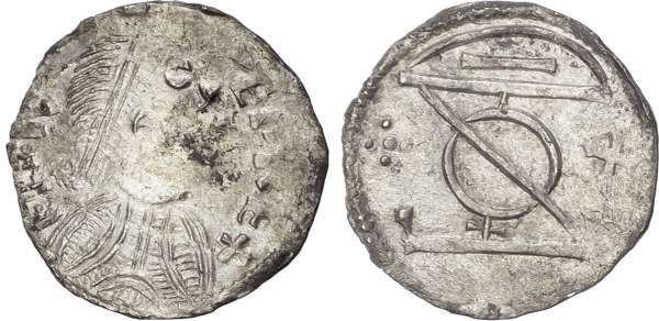 This example belongs to a group of good style Viking imitations of the London issued Monogram coins of Alfred the Great. MacKay, in his Corpus of London Monogram Coins of Alfred the Great and the Danelaw (British Numismatic Journal 89, 2019), noted six examples of Danelaw A pence struck from six die combinations.