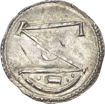 This example belongs to a group of coarse-style Viking imitations of the London-issued Monogram coins of Alfred the Great, struck in the Danelaw circa 885?90. MacKay, in his Corpus of London Monogram Coins of Alfred the Great and the Danelaw (British Numismatic Journal 89, 2019), noted fourteen examples of Danelaw E pence struck from twelve die combinations. Of these, twelve are in institutional collections and this coin is one of just three or so of this type available to collectors.