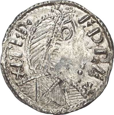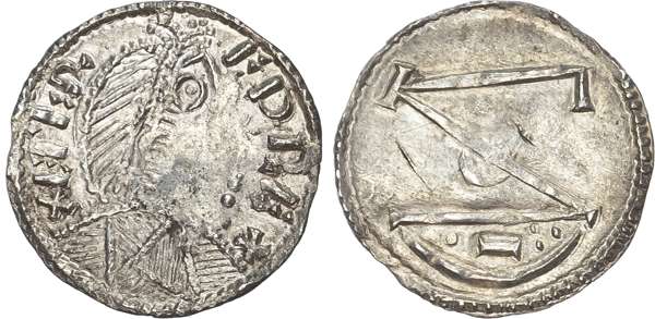 Danelaw (c.890), Five Boroughs, Penny, imitation of London Monogram type A, of Alfred the Great, unnamed moneyer, coarse style, type E, XL-F D' EDREX, F inverted, diademed bust right. Rev, monogram with inverted N and L, 1.30g. (MacKay Danelaw E, obverse similar to coin 5.1, die combination 5, O5/R5 – see plate 6, no. 95; S.964; cf. N.463). Extremely fine, weak on face but about as struck, of the highest rarity.