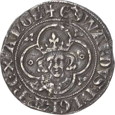Edward I (1272-1307), Groat, London, facing crowned bust with large broad face and short hair, crown with spread side fleurs, surrounding quatrefoil in two beaded and one thick linear lines, drapery with rosette on breast, fleurs in spandrels, colon stops in legend, serif type X, initial mark cross pattée. Rev, long cross fourchée, upon twin concentric legends, trefoil of pellets in each inner angle, 5.44g (S.1379D ; N.1009; Brady -; Fox 7, variety d; SCBI 39:11). Gilded on the reverse as so often found, some marks otherwise toned very fine and better struck than usual.