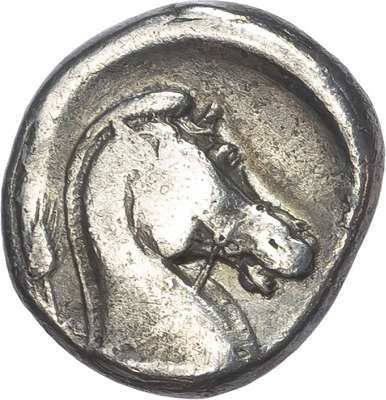 Helmeted and bearded head of Mars left, sprig of oak-leaves behind. Rev. Bridled horse’s head right, on tablet inscribed [ROMANO], ear of grain behind. (Crawford 13/1; Sydenham 1). Fair. An affordable example.
