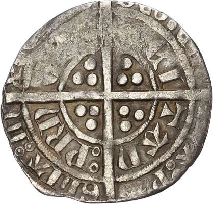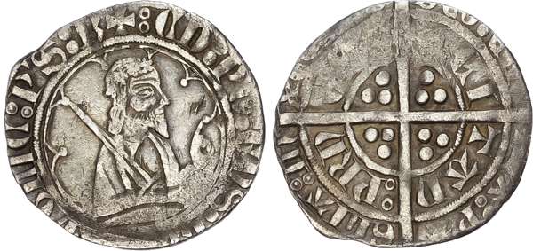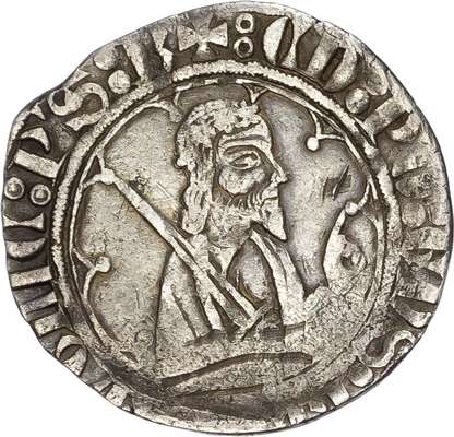 Second issue. Bordeaux mint. Half-length figure of Edward right, holding sword over right shoulder and raising left hand in benediction, within tressure of arches; pellet-in-annulet below, +ЄD' : PΛRDVS : RЄGIS : ΛnCLIЄ : PS : B (double pellet and double pellet-in-annulet stops). Rev, Long cross pattée, trefoils in quarters, GLIΛ : In X[CЄLCIS DЄO : Є In TRΛ] : PΛ/ : PRI CPS ΛQI TΛn, (double pellet and double pellet-in-annulet stops). (SCBC 8131; Elias 170; AGC 200, 3/b). Near Very Fine, toned.