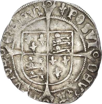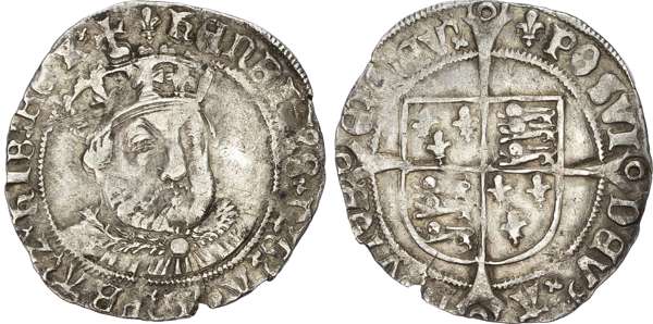 HENRIC 8 D G AGL FRA Z HIB REX, crowned bust facing one-quarters right. Rev, POSVI DEV A DIVTOR E MEV, quartered shield of arms over long cross fourchée, annulets in forks, 2.35g. (S. 2369; N. 1844). Very Fine.