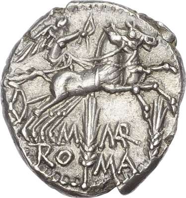 Helmeted head of Roma facing right, modius behind, mark of value to right. Rev. Victory, holding reins and whip, driving biga right, ear of grain below and to right, M-AR / RO-MA below. (Crawford 245/1; Sydenham 500). Good Very Fine.