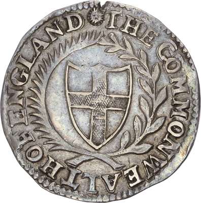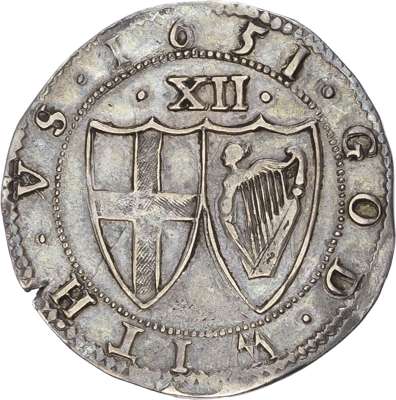 Coat-of-arms within wreath, THE COMMONWEALTH OF ENGLAND, without stops. Rev, coats-of-arms bearing St. George's Cross and Irish harp, mark of value above, GOD . WITH . VS . 1651 ., 5.98gm (S. 3217; Bull 100; N. 2724). Very Fine or better, legend slightly double struck in parts, toned.