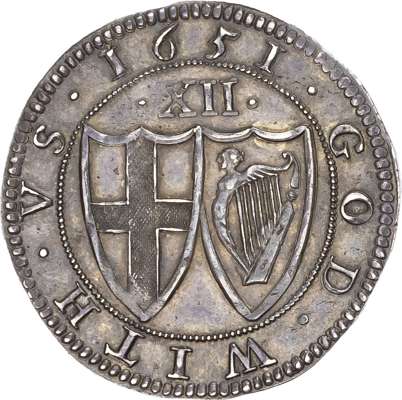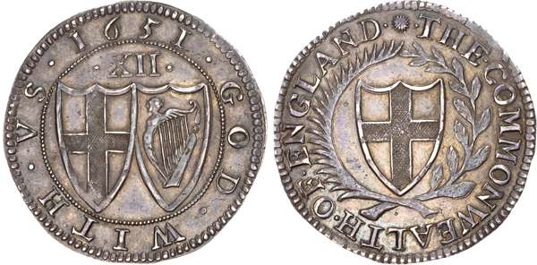 Commonwealth (1649-1660). 1651. Silver 'Fine Work' Shilling 6.08g. Tower mint, im: sun/-. Dated 1651. (sun) Coat-of-arms within wreath, · THE · COMMONWEALTH · OF · ENGLAND ·. Rev, coats-of-arms bearing St. George's Cross and Irish harp, · GOD · WITH · VS · 1651 ·, ·XII· (mark of value) above. (ESC 983; North 2724; S.3217). Choice about as struck. Proof like fields, delightfully toned. A quintessential example of the Commonwealth fine work series. Very rare, seldom seen on the open market with an illustrious and sequential provenance dating back to the mid 19th century. Very rare.