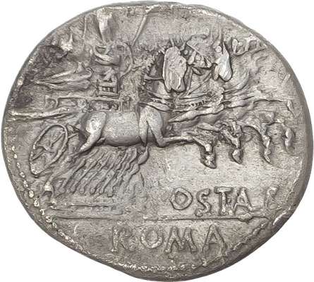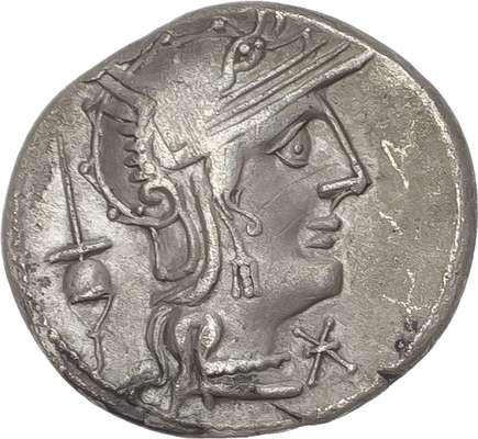 Helmeted head of Roma right, apex behind, mark of value to right. Rev. Mars, holding trophy, shield and spear, driving quadriga right, POST A B below, ROMA in exergue. (Crawford 252/1; Sydenham 472). Good Very Fine. Some scuffs.
