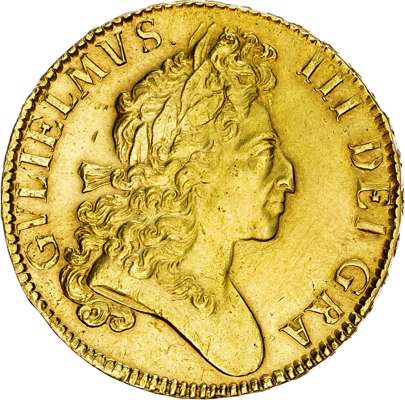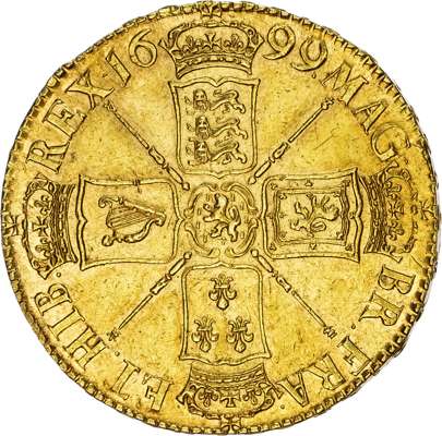 William III (1694-1702), Five-Guineas, 1699, first laureate head facing right, legend within toothed border reads GVLIELMVS. III. DEI. GRA. Rev, legend reads .MAG. BR. FRA. ET. HIB. REX with the date either side of top crown. Crowned cruciform shields, Lion of Nassau at centre, sceptres in angles, six strings to Irish harp, edge inscribed in raised letters +.DECVS. ET. TVTAMEN.ANNO.REGNI.UNDECIMO (S.3454; MCE. 169; Schneider.478). Well struck. Obverse good very fine or better, smoothed in the field in front of the portrait. The reverse delightful, extremely fine with underlying brilliance.