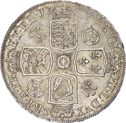 George I (1714-27), Crown, 1716, laureate and draped bust right, toothed borders surrounding, reads GEORGIVS DG M BR FR ET HIB REX FD. Rev, crowned cruciform shields, eleven strings to Irish harp, garter star, roses and plumes in angles, date flanking top crown, reads BRVN ET L DVX S.R.I.A:TH ET. EL, edge inscription as DECUS ET TUTAMEN ANNO REGNI SECVNDO (S.3639; Bull.1540; ESC 110). Olive blue mixed toning fused in a steel grey patina, much of its original mint bloom visible around the periphery. Little flecking both sides with a comprehensive portrait of the King. Good extremely fine and about as struck, very rare so well preserved.