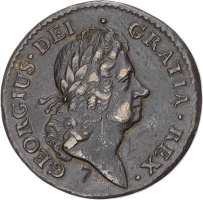 Laureate bust right with sharp truncation with countermark '7' below, reads from bottom left of coin GEORGIUS DEI GRATIA REX•, stop after X, no stop after date. Rev, crowned rose with seventeen pellets in centre, ROSA AMERICANA 1723 above, '7' countermark either side of crown, below UTILE DULCE in semi-circular compartment, 7.89g (Breen 121; Nelson 15; Martin p348 for countermark). Darkly toned with some flashes of the underlying mint lustre, interesting with the countermarks. Portrait proficiently struck with clear legends both sides. Some light contact marks otherwise a good very fine, rare.