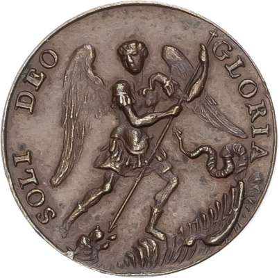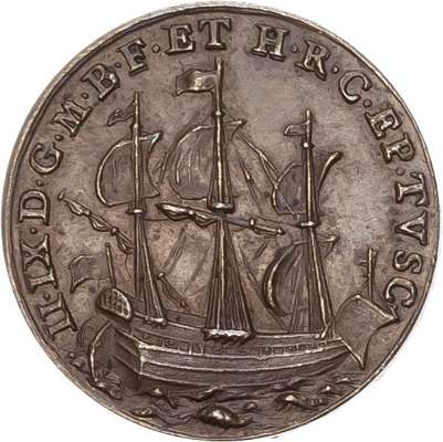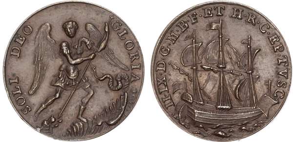 Jacobite, Henry IX copper pattern Touch Piece 3.42gm. (ca. 1788-1807). Probably of Italian manufacture - by G. Hamerani. Sailing ship right; rev. St. Michael slaying the dragon (Woolf Obv 3.a/ Rev 3.a). Good Extremely Fine, nicely toned.