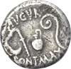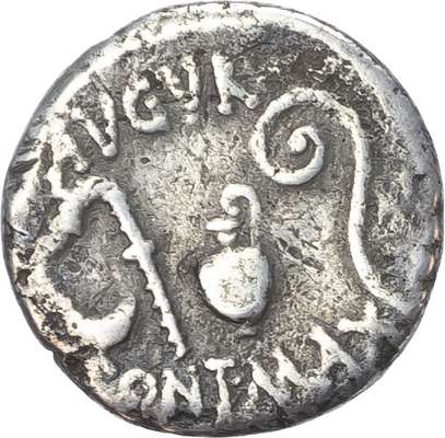 COS TERT / DICT ITER, wreathed head of Ceres right. Rev. AVGVR – PONT MAX, culullus, aspergillum, jug and lituus. (Crawford 467/1b; Sydenham 1024). Fair.