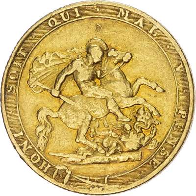 First laureate head right, date below, legend surrounds from the lower left GEORGIUS III DG BRITANNIAR REX FD. Rev, Saint George slaying the dragon right, incuse BP below broken lance denoting engraver Benedetto Pistrucci, garter motto surrounding with buckle in French HONI SOIT QUI MAL Y PENSE, edge milled (S. 3785C; Bull 905; MCE 466; Marsh 4E). Good Fine, toned with much eye appeal, scarce.