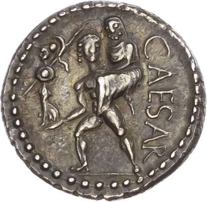 Diademed head of Venus facing right. Rev. CAESAR, Aeneas carrying his father, Anchises, and a palladium. (Crawford 458/1; CRI 55). Good Very Fine. A couple of marks to the obverse. Excellent reverse. Pleasing cabinet tone.