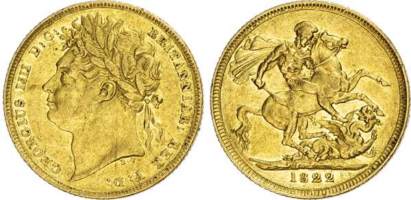 George IV (1820-1830), Sovereign, 1822. First laureate head left. Rev, St. George slaying the dragon, date in exergue, no serif to 1 of date (S. 3800; Bentley 13/950; Marsh 6; MCE 472). Good very fine.