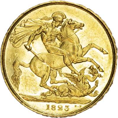 George IV (1820-1830), Two Pounds, 1823, laureate head left, reverse St. George and Dragon, edge lettered DECUS ET TUTAMEN. ANNO REGNO IV, (EGC 945; S.3798). Extremely fine, the reverse better, lustrous.