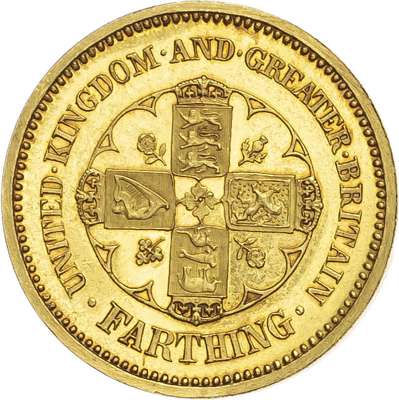 Victoria (1837–1901) Pattern Farthing in gold 1887, by L.C. Lauer for A Weyl, 6.05gm. Crowned and draped bust left, rev. Royal arms in cruciform within a spandril of 12 arcs, flowers in angles, edge plain. (Peck-2200; Freeman-935; BMC 2200). As struck, previously graded by PCGS as ‘PR 63 CAM’, believed to be unique by Freeman).