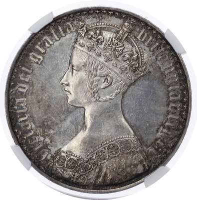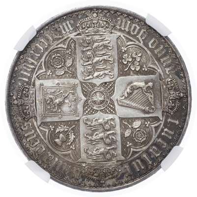 Victoria (1837-1901), Proof Crown, 1847, gothic type, undecimo. Crowned gothic style bust left. Rev, crowned cruciform shields, emblems in angles above ornamental cross hatching, garter star at centre (S. 3883; Bull 2571; ESC 288). Encapsulated by NGC as PF61.
