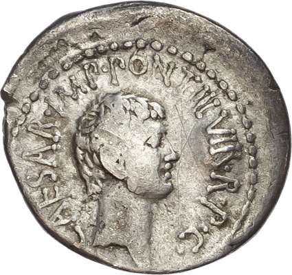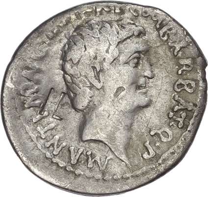 Ephesus (?), M. Barbatius Pollio, quaestor pro praetore, 3.43g. M•ANT•IMP•AVG•III•VIR•R•P•C•M•BARBAT•Q•P, bare head of Mark Antony facing right. Rev. CAESAR•IMP•PONT•III•VIR•R•P•C•, bare head of Octavian facing right. (Crawford 517/2; Sydenham 1181). About Fine. Marks.