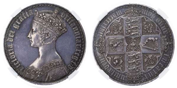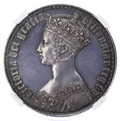 Victoria (1837-1901) Proof Crown, 1847, gothic type, undecimo. Crowned gothic style bust left. Rev, crowned cruciform shields, emblems in angles above ornamental cross hatching, garter star at centre (S. 3883; Bull 2571; ESC 288). In NGC holder graded Proof Details Edge Damage (6770027-002), otherwise About As Struck.