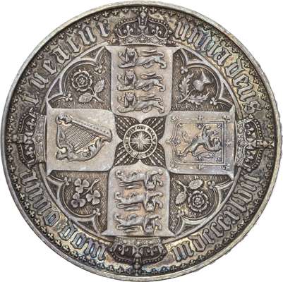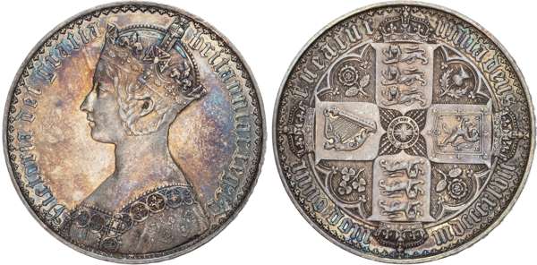Victoria (1837-1901) Proof Crown, 1847, gothic type, undecimo. Crowned gothic style bust left. Rev, crowned cruciform shields, emblems in angles above ornamental cross hatching, garter star at centre (S. 3883; Bull 2571; ESC 288). A touch of rub to the braid and thus About Extremely Fine, however, obv. fields and rev. better, a very attractive example, colourfully toned.