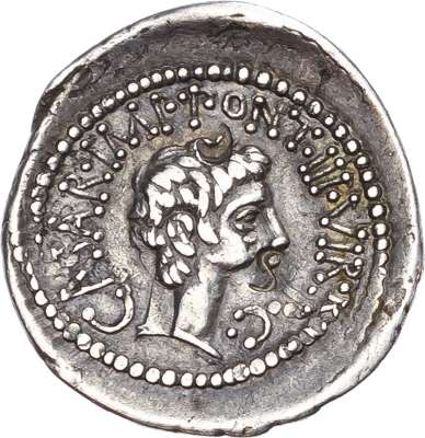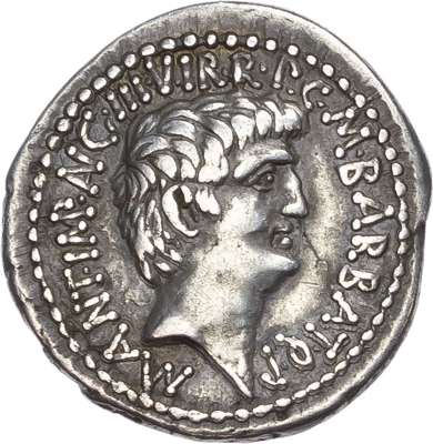 , M. Barbatius Pollio, quaestor pro praetore, 3.56g. M•ANT•IMP•AVG•III•VIR•R•P•C•M•BARBAT•Q•P, bare head of Mark Antony facing right. Rev. CAESAR•IMP•PONT•III•VIR•R•P•C•, bare head of Octavian facing right. (Crawford 517/2; Sydenham 1181). Good Very Fine. Banker’s mark to reverse and reverse heavily off-struck.