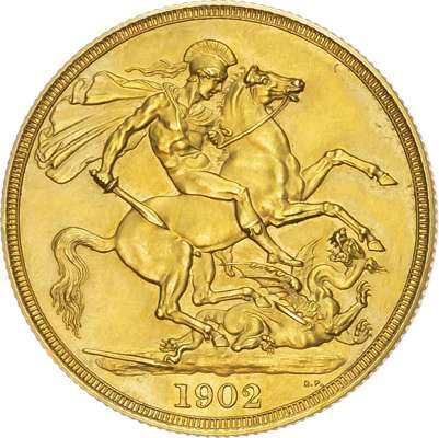 Bare head right, DE S. below truncation for engraver George W De Saulles, legend surrounding, EDWARDVS VII DEI GRA BRITT OMN: REX FID DEF IND IMP. Rev, Saint George slaying the dragon with sword, B.P. in exergue for engraver Benedetto Pistrucci, edge milled (S. 3968; Bull 1403; Marsh T41). Practically As Struck, choice.