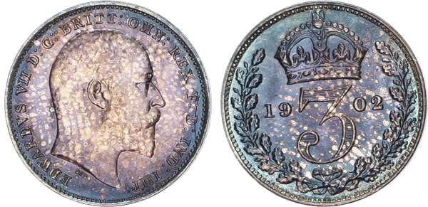 Bare head right, DES raised below truncation for engraver G. W. De Saulles, legend and toothed border surrounding, EDWARDVS VII DG BRITT OMN REX FD IND IMP. Rev, crowned mark of value with date either side all within oak wreath (S. 3985; Bull 3607; ESC 2517). Fourpence Good Extremely Fine, others virtually As Struck, enchanting iridescent tone to all four coins with original red leather dated case of issue (sound).