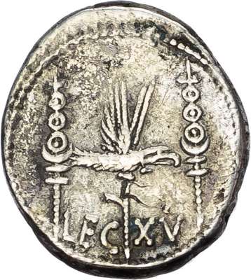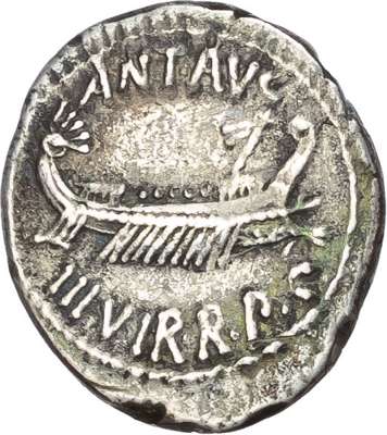 ANT•AVG – II•VIR•R•P•C, praetorian galley right. Rev. LEG – XVI, aquila between two standards. (Crawford 544; Sydenham 1224). Good Very Fine.