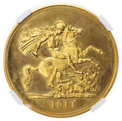 George V (1910-1936), Coronation Specimen 'Long Set', 1911 (12), Proof Five-Pounds to Half-Sovereign; Proof Halfcrown to Maundy Penny (S.PS11). An exceptional matching set all graded highly by NGC. Accompanied with original red case of issue.